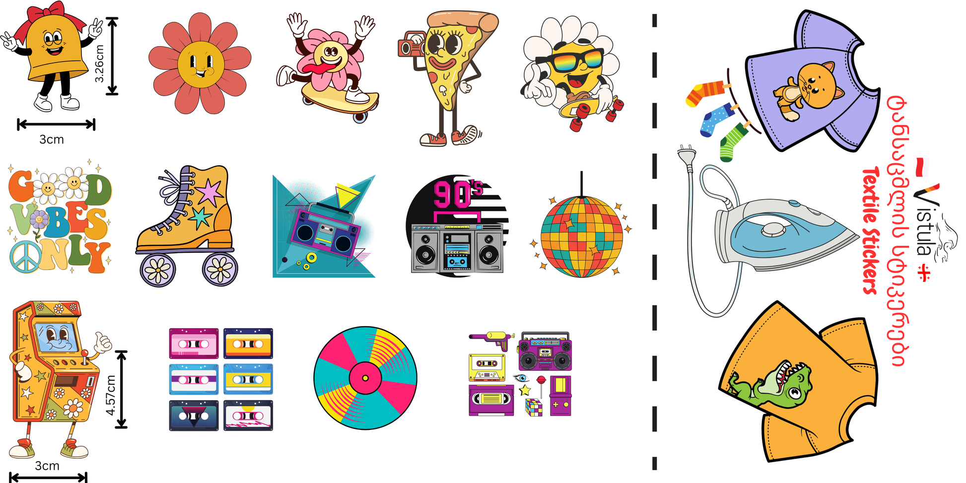 ტანსაცმელზე (ტექსტილზე) გადასატანი სტიკერები 14 ცალიანი სეტი/ Textile Stickers 14 Pieces Set