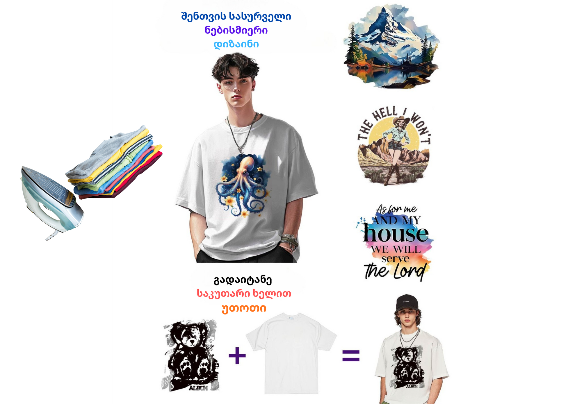 👉 შექმენი შენი სასურველი დიზაინის, ფორმისა და შინაარსის სტიკერი, რომელსაც შენივე ხელით, უთოთი, გადაიტან ნებისმიერ ქსოვილზე.